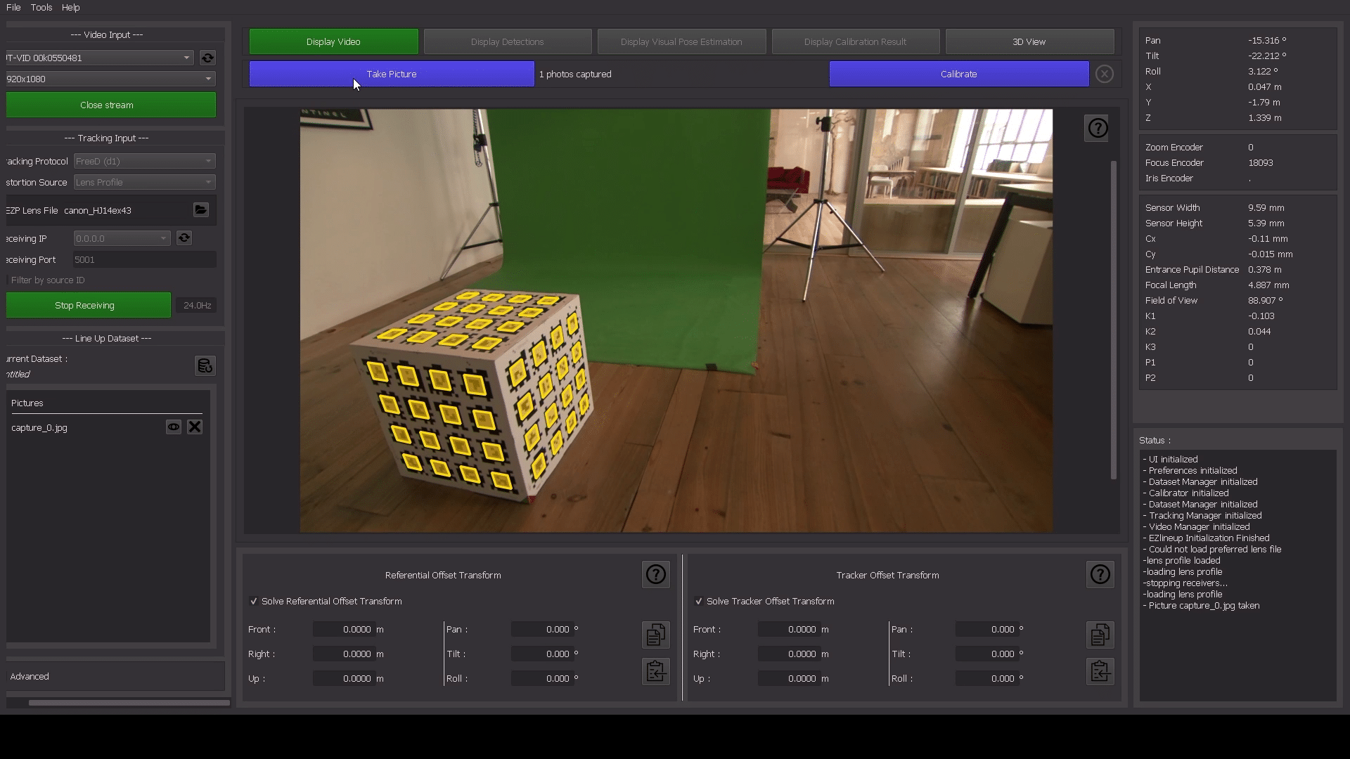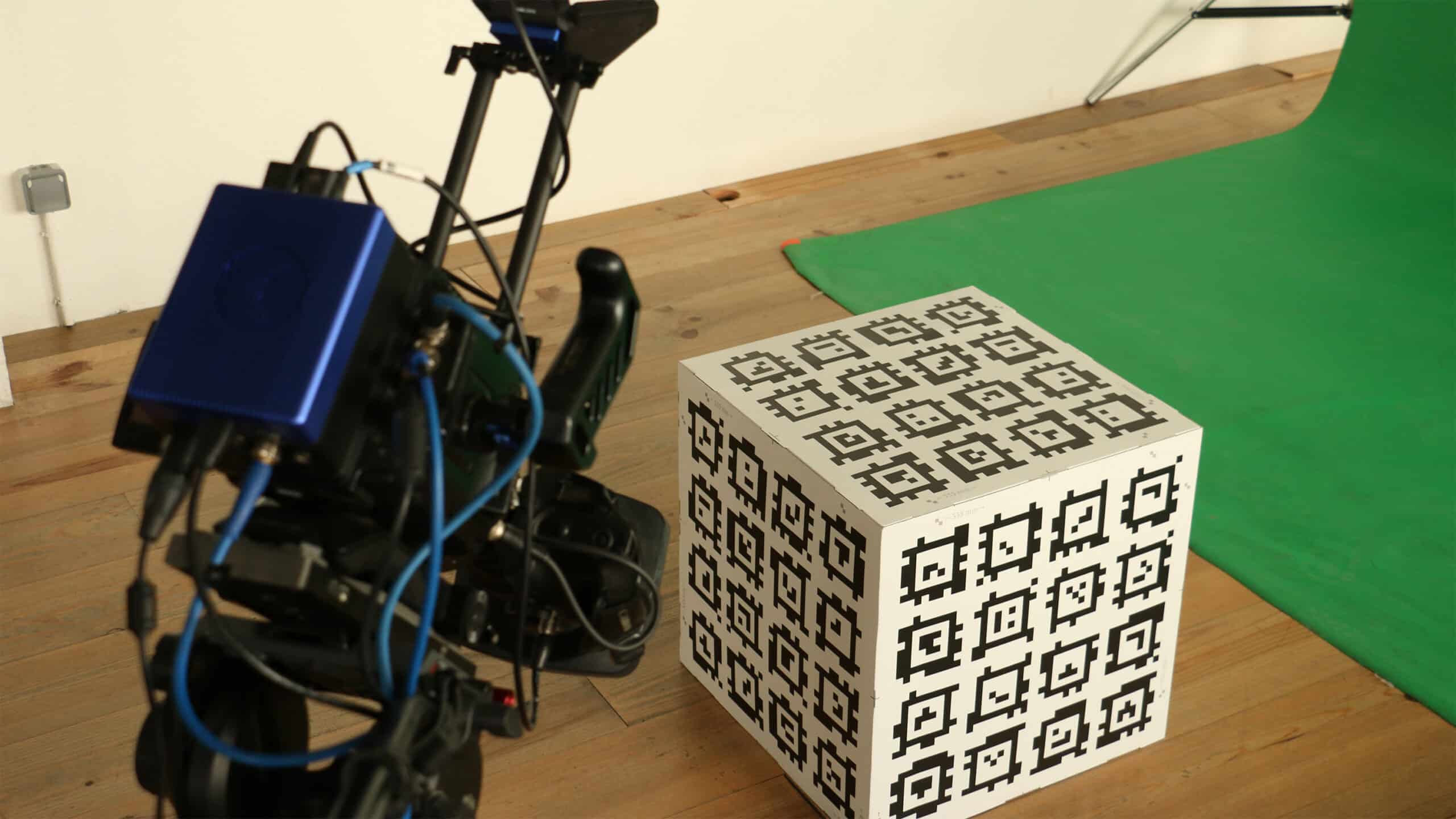 Using our tag-based cube calibrator (available as either premium aluminum-made version or standard cardboard-made version) that user places on stage’s origin reference and captured by the camera from multiple viewpoints, CalibFX® Lineup combines the live Freed tracking data flow with an accurate lens profile generated by our patented lens profiler, into a computer vision-based solver:  the recorded data is then automatically computed to deliver accurate alignment and spatial consistency.