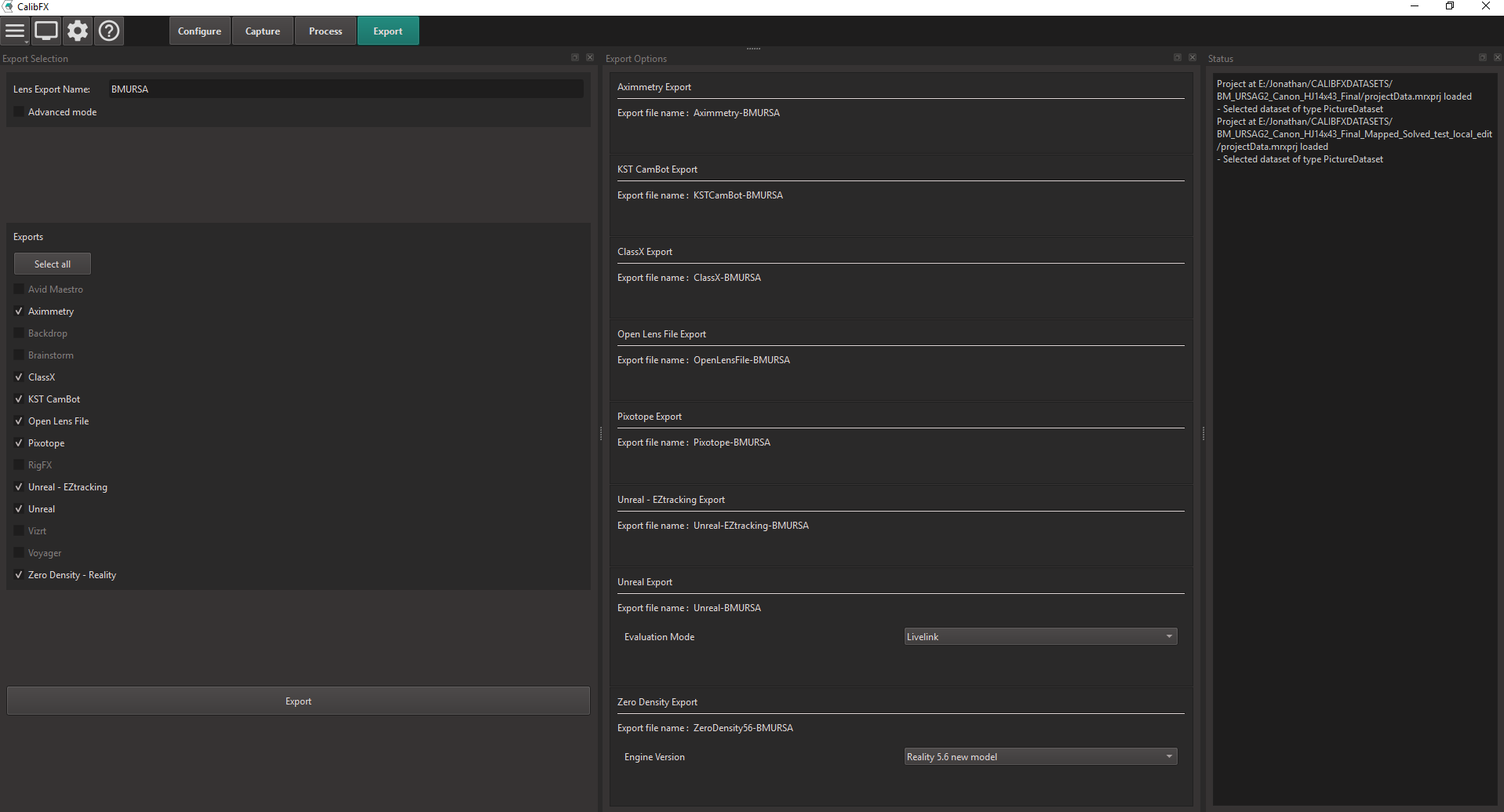 The export is fairly straightforward. Name your lens file, select which targets you want, and press "Export".