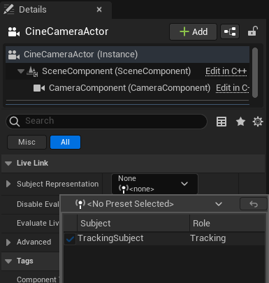 Add a Livelink Tracking Controller component to the Cine Camera Actor: