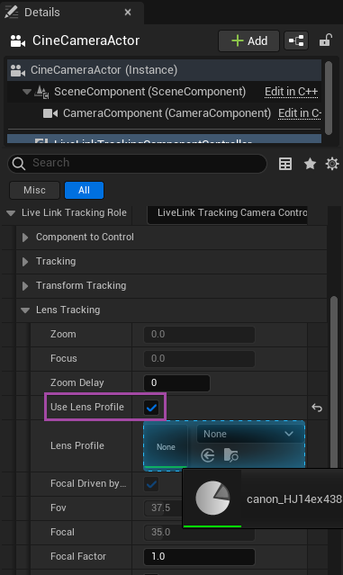 The camera must receive the lens tracking through a Livelink component, like when using the Livelink FreeD plugin.