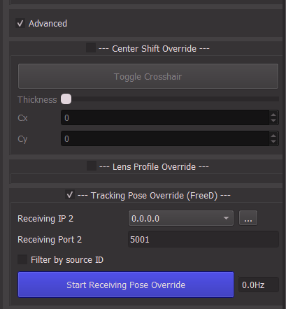 Check Tracking Pose Override (FreeD). This only supports the FreeD protocol currently. Set the IP and Port targeted by the second tracking system and press Start Receiving Pose Override.