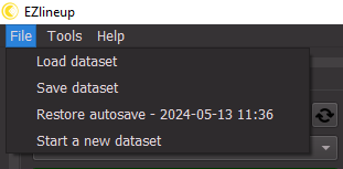 Like project files in other software, datasets can be saved and loaded. They are edited from within EZlineup and should not be tampered with manually outside at the risk of corrupting them.