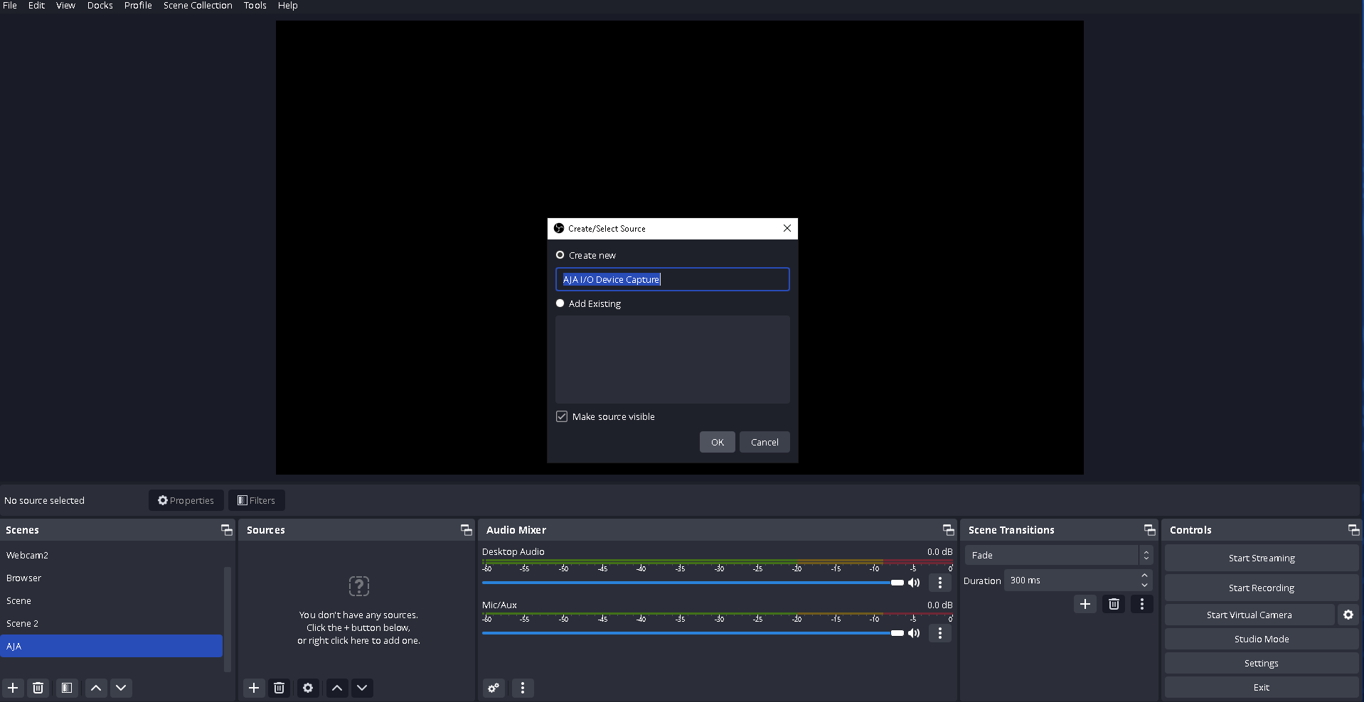 Open OBS. Create a new scene or use the default empty scene at the bottom left: