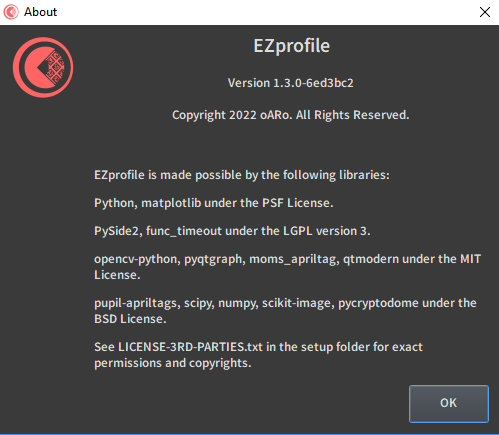 Opens the About window. It can be used to check the software version and license of all libraries used.