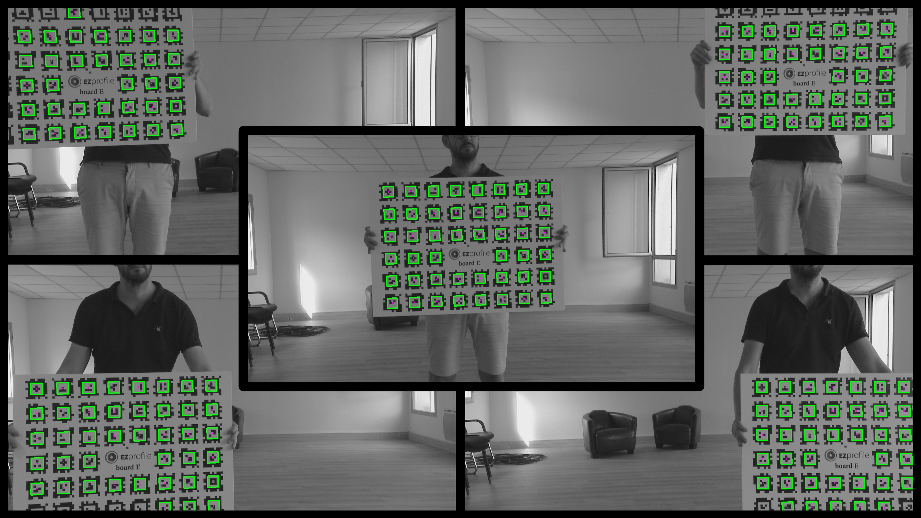 For estimating distortion, you have to distribute tags across the whole screen. The denser the tag distribution the better, so you want to use boards B, D or F whenever possible. You should hold the board approximately parallel to the camera image plane for these pictures.