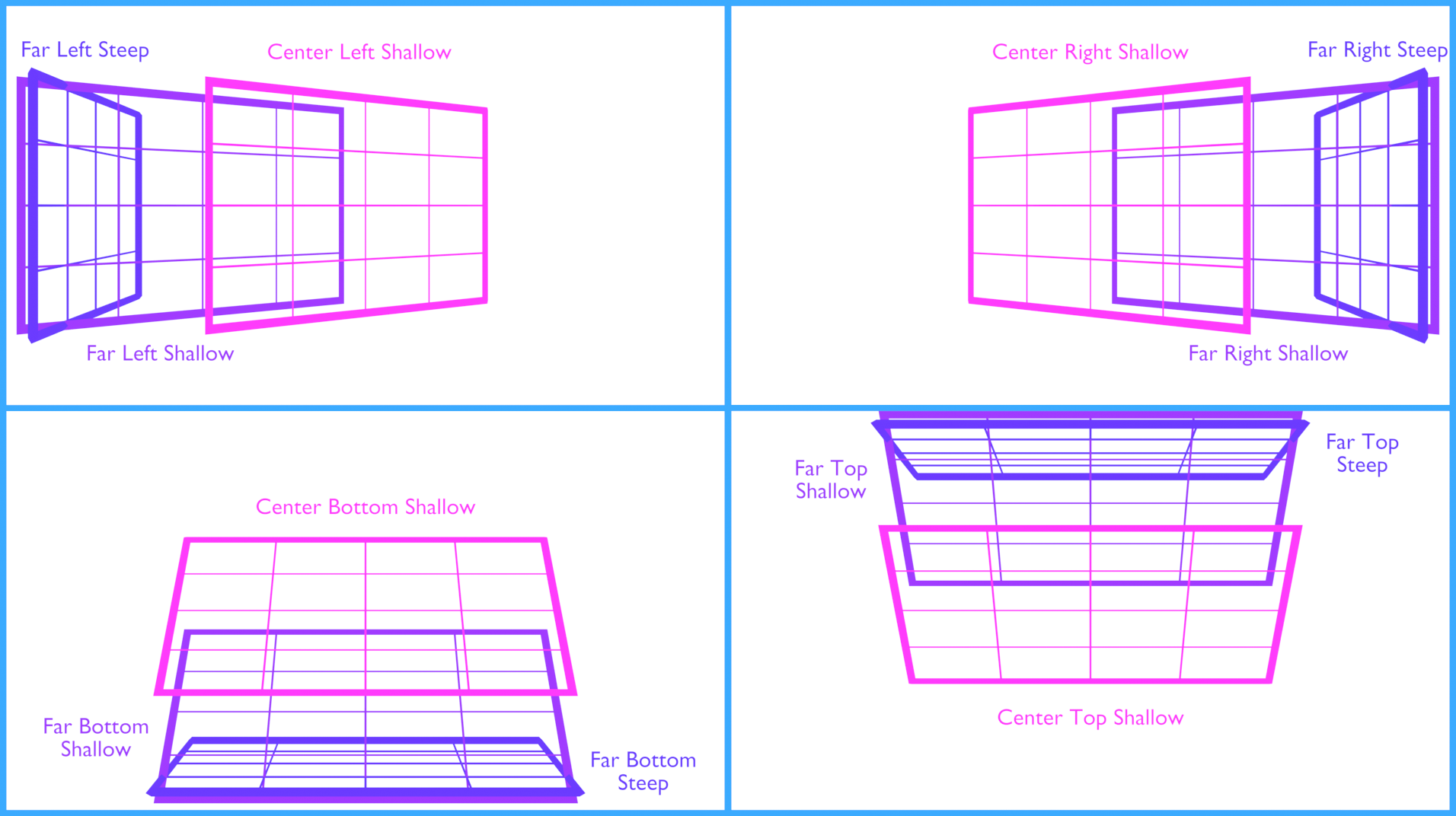 On the example picture above, note how the board is held at a very steep angle relative to the camera. The drawing below illustrates why steep angles are needed for FOV precision. While the method used in EZprofile is more accurate than shoddy red lines, it uses vanishing points too.