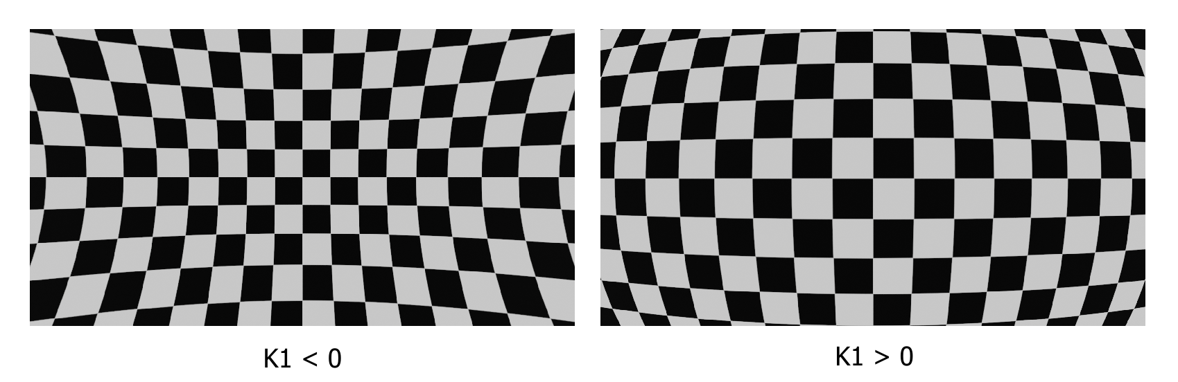 K2 has a similar effect, but stronger near the borders than for K1. The combination of the two approximates well spherical distortion.