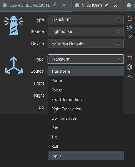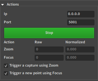 Click on the action drop-down menu to show an interface like in the image below. It is similar to the lens tracking interface from Lens Tracking network-wise. Configure it to listen to the rig you have set up in EZtrack (or your custom apparatus).