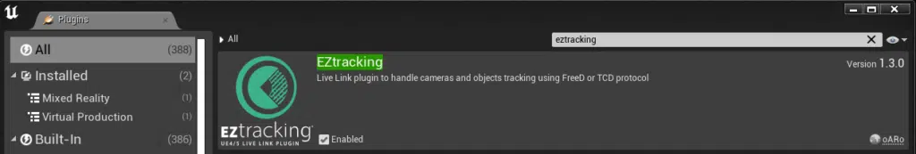 2. Open your project and check if the plugin is Enabled in Edit > Plugins > Installed > Virtual Production