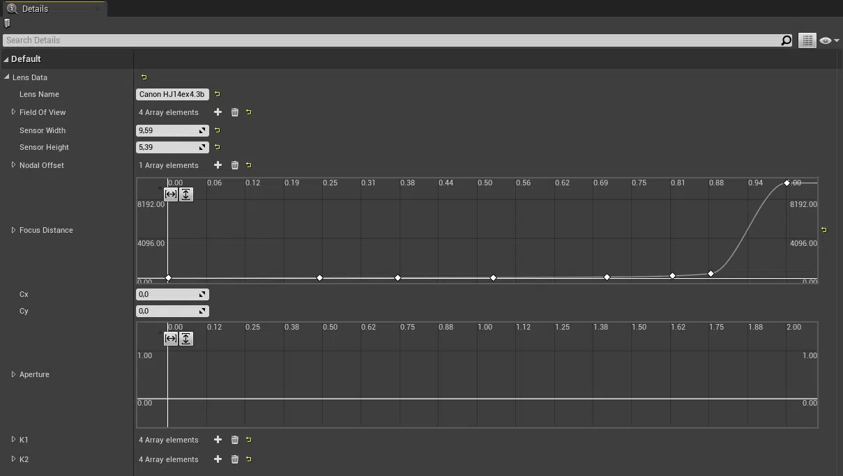 Nodal Offset : The nodal offset of the optical system. The x-axis of the curve is the Zoom value between [0; 1] and the y-axis the Nodal Offset in cm from the sensor