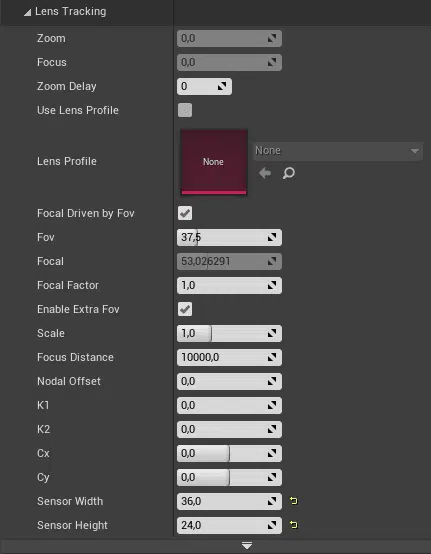 - Lens Profile : Select a Lens Profile asset to convert the zoom and focus values received into focal length and focus distance.