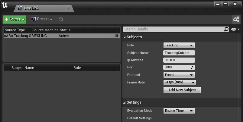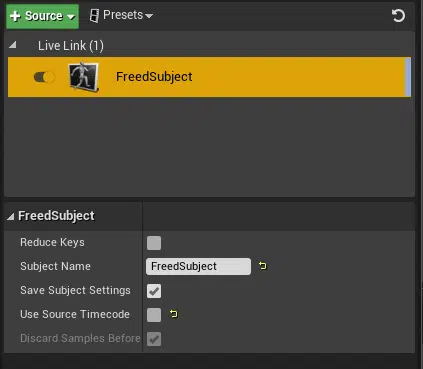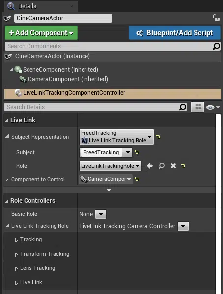 7. Click on the Live Link Tracking Controller, and in Subject Representation, select the Freed Subject previously created