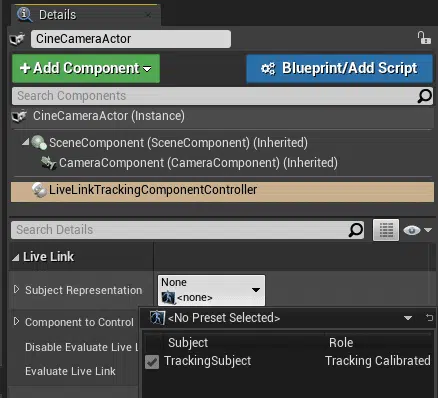 6. Click on the newly created Cine Camera Actor, then on Add Component in the details window, and select a **Live Link Tracking Controller**.