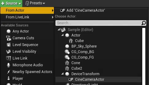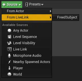 2. Click on + **Source > From LiveLink > ‘YourLiveLinkSubjectName’**.