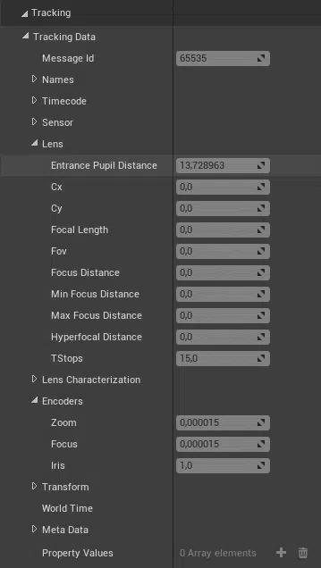 - Tracking Calibrated : Incoming data is translated into transform, normalized zoom / focus / iris values, calibration data and various information from the lens / camera / tracking source