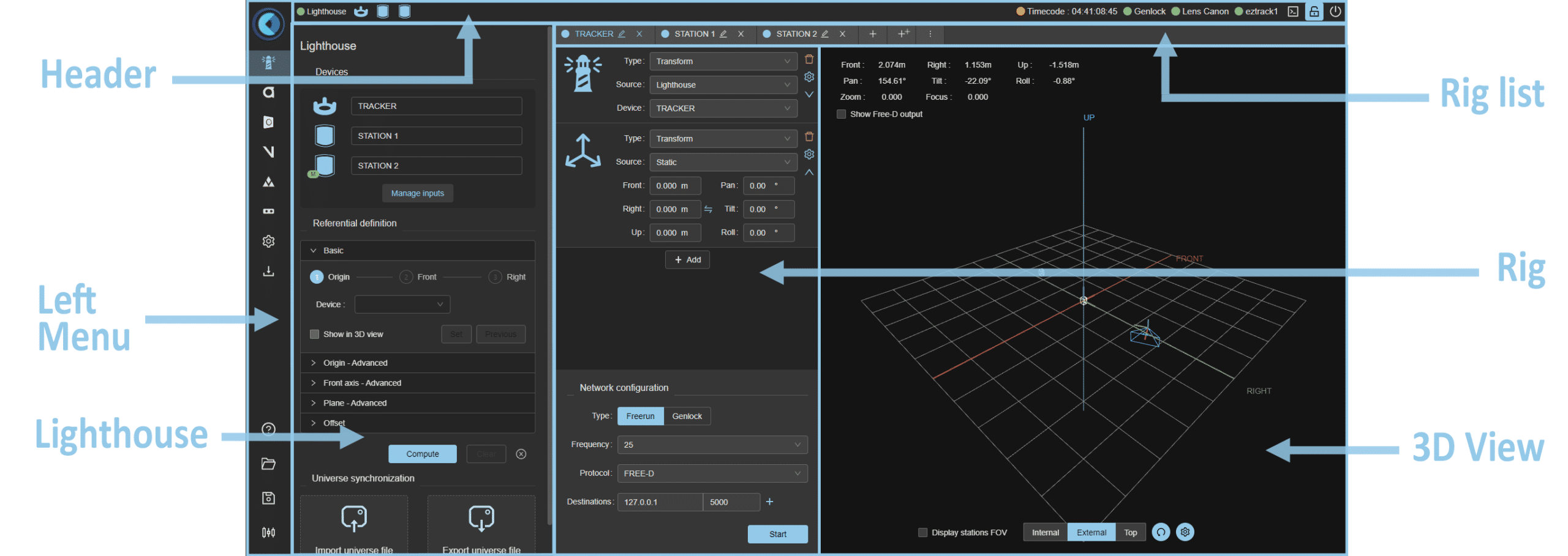 At the top, below the EZtrack logo are seven menu items representing respectively the "SteamVR", "Antilatency", "Optitrack", "Vicon", "VectorNav", "Encodacam" and "Freed Input" tabs. Each of these corresponds to a way of receiving positioning or lens data from different source.