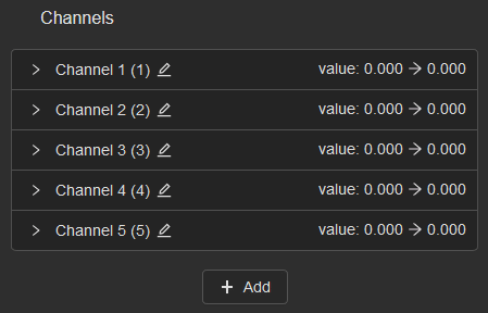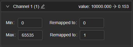 Each list item shows the name of it's channel, index and last value received (formatted as “value received” -> “remapped value”). Clicking on a channel will display it's configuration in a new panel.