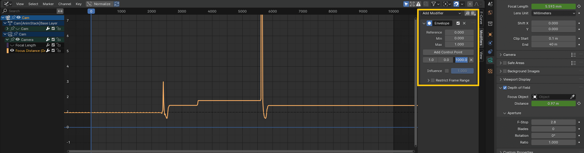 Add an Envelope modifier with a control point at frame 0 that maps from (min=0; max=1) to (min=0; max=1000), effectively converting the focus distance from metres to millimetres: