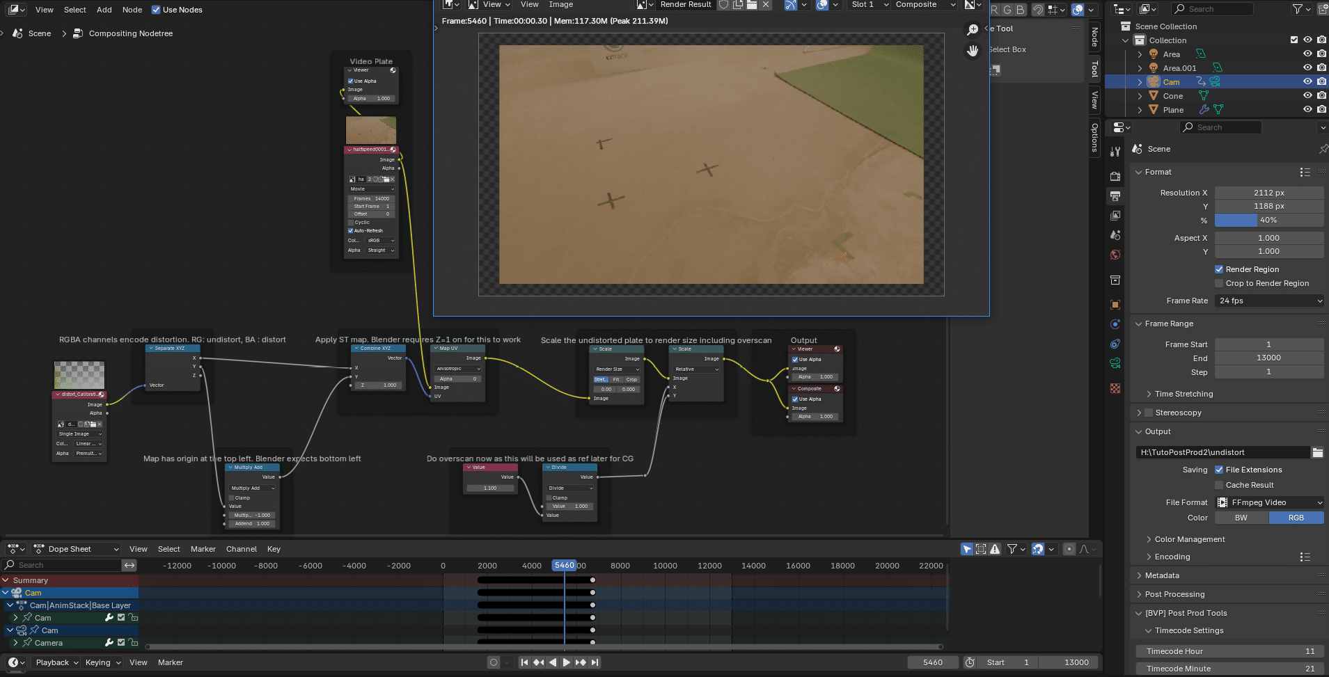 Note the 1.1 overscan value applied at the end to scale the image down. This is compensated by a higher render resolution in the output settings on the right. When distorting a CG render, pixels may need to be fetched from outside the rendered area. This is why when doing VFX the render is always larger than the desired resolution to be able to retrieve these pixels in final compositing. This is overscan.