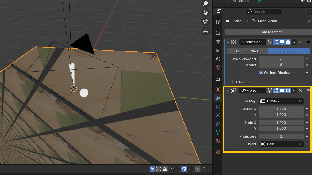 Now that we have the camera in the scene, we can use it to project the video on CG elements, like the shadow catcher, for more accurate reflections.