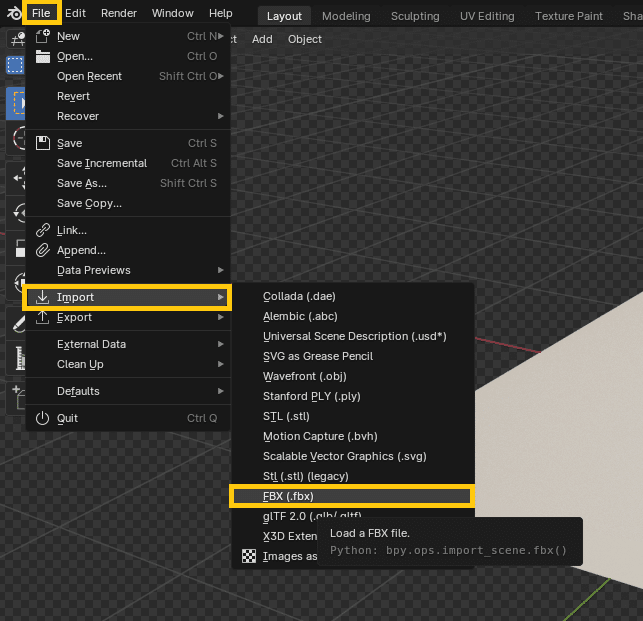 In addition to the video plate, we have a tracking FBX file. To load it in the blender scene, got to File→Import→FBX: